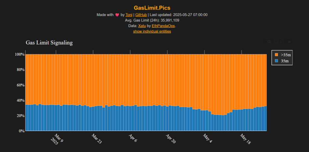 Более 150 000 валидаторов Ethereum (15% сети) поддержали повышение лимита газа до 60 млн — сейчас он составляет 36 млн.