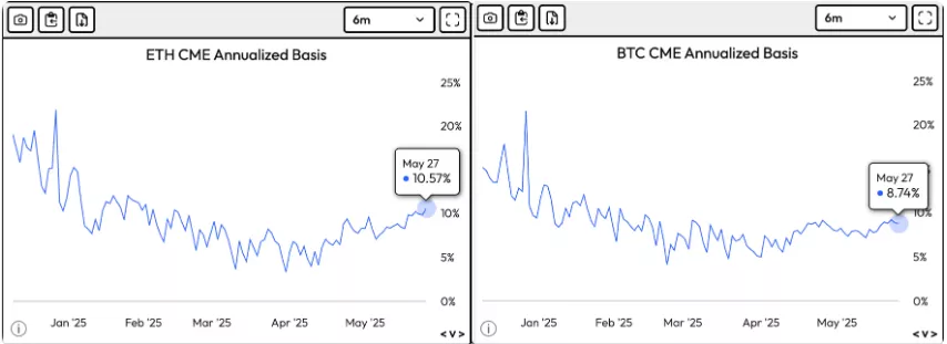 Премии по фьючерсам на Ethereum подтверждают эту тенденцию. По данным Velo, месячные фьючерсы на ETH торгуются с годовой премией 10,57% — максимум с января. Биткоин-деривативы показывают 8,74%.