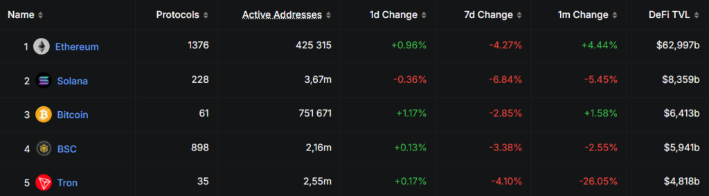 Общий TVL децентрализованных приложений на базе биткоина составляет $6,41 млрд. Сегмент занимает третью строчку рейтинга DeFi Llama, уступая лишь экосистемам на основе Ethereum и Solana.