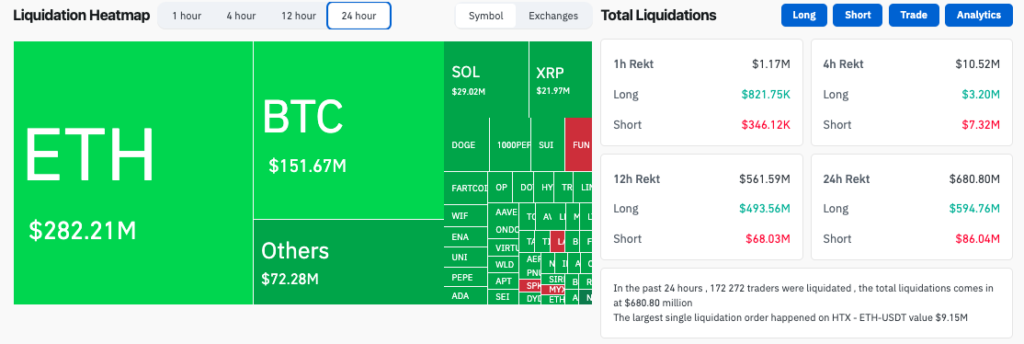 По данным Coinglass, объем ликивидаций за прошедшие 24 часа достиг $682 млн. Большая часть пришлась на длинные позиции в Ethereum ($282 млн).