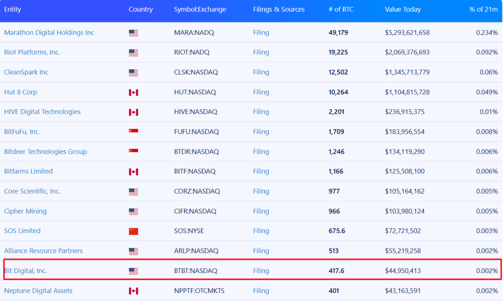 Биткоин-резервы Bit Digital и других публичных компаний. Данные: Bitbo.