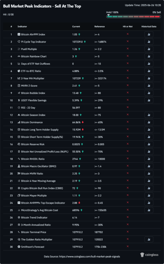 «Тактические возможности еще могут сохраняться, но сигналы ончейн-метрик в долгосрочной перспективе игнорировать не стоит», — подытожил специалист.Примечательно, что пока ни один из представленных на CoinGlass индикаторов пока не сигнализирует о циклическом пике и целесообразности продажи криптоактивов.
