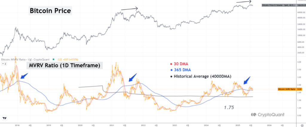 Индикатор MVRV пока не указывает на разворот цены биткоина, однако текущая фаза роста, вероятно, приближается к завершению. Такое мнение высказал аналитик CryptoQuant под ником Yonsei_dent.