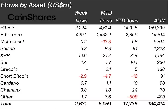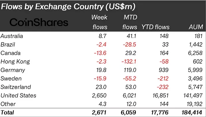 На региональном уровне поступления за неделю практически полностью обеспечили зарегистрированные в США продукты — $2,65 млрд. Фонды из Швейцарии и Германии внесли скромный вклад в размере $23 млн и $19,8 млн соответственно.
