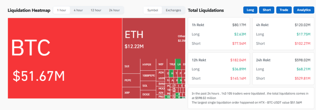 Согласно Coinglass, за прошедшие сутки объем ликвидаций достиг $598 млн. На короткие позиции пришлось $529 млн.