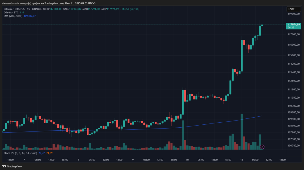 Первая криптовалюта вновь обновила исторический максимум, в моменте достигнув $118 404 в паре BTC/USDT на крупнейшей криптобирже Binance.