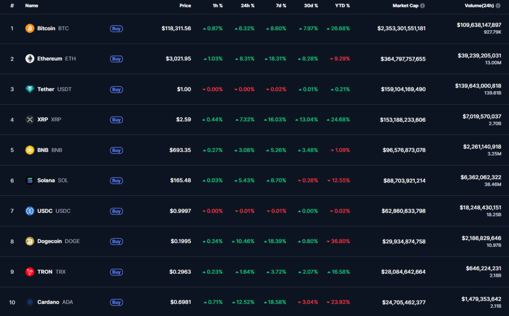 Топ-10 наиболее капитализированных криптоактивов. Данные: CoinMarketCap.