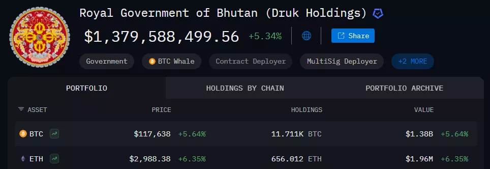 Согласно Arkham, Бутан все еще хранит 11 711 BTC ($1,38 млрд). Это эквивалентно 40% валового внутреннего продукта страны. В резервах также числится 656 ETH.