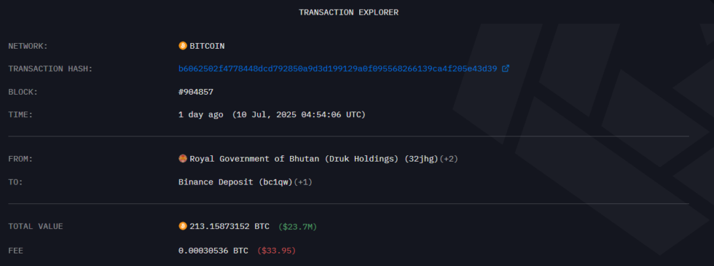 10 июля правительство Бутана перевело 213,31 BTC ($23,7 млн) на биржу Binance. Транзакцию провели через несколько часов после того, как цена биткоина обновила исторический максимум вблизи отметки $113 500.