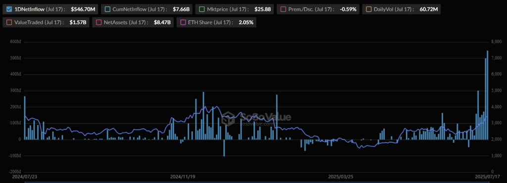 На фоне резкого роста цены второй по капитализации криптовалюты суточный чистый приток в биржевой фонд ETHA от BlackRock достиг $546,7 млн.