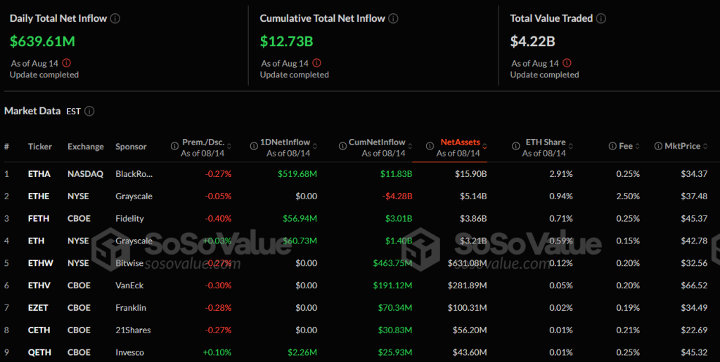 14 августа чистый приток в спотовые Ethereum-ETF в США составил $639,6 млн.