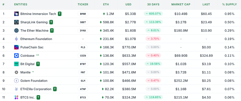 На момент написания под управлением публичных компаний находится 3,57 млн ETH стоимостью $16,5 млрд. Крупнейший держатель — BitMine Immersion Technologies.