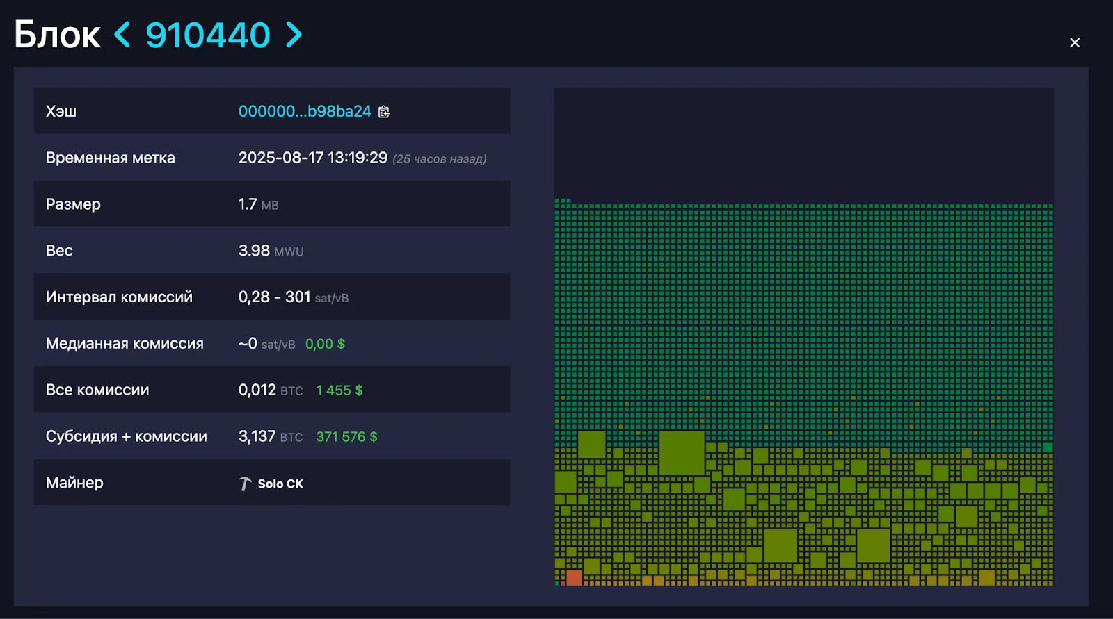 17 августа майнер-одиночка самостоятельно добыл блок #910 440 в сети первой криптовалюты, получив 3,137 BTC (~$371 576) в виде вознаграждения и комиссий.