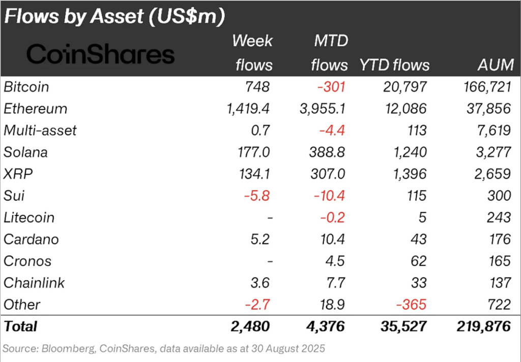 С 22 по 30 августа приток в инвестпродукты на базе цифровых активов достиг $2,48 млрд. По итогам прошлого месяца совокупный показатель составил $4,37 млрд