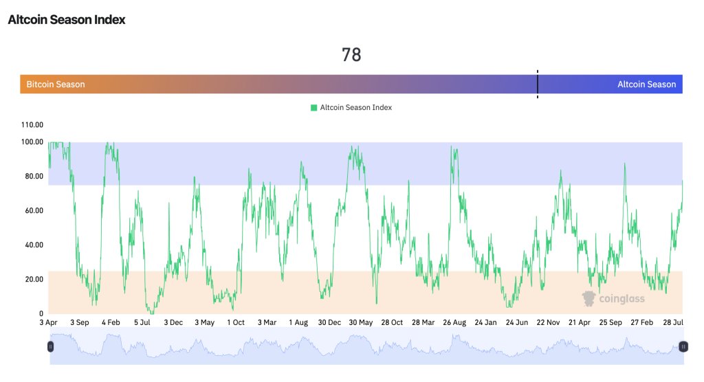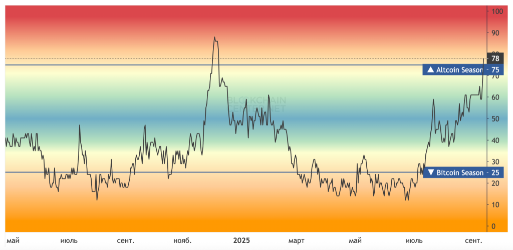 Ключевые индикаторы рынка альткоинов приблизились к пиковым значениям конца прошлого года. За последние сутки Altcoin Season Index от CoinGlass вырос с 67 до 78 пунктов.