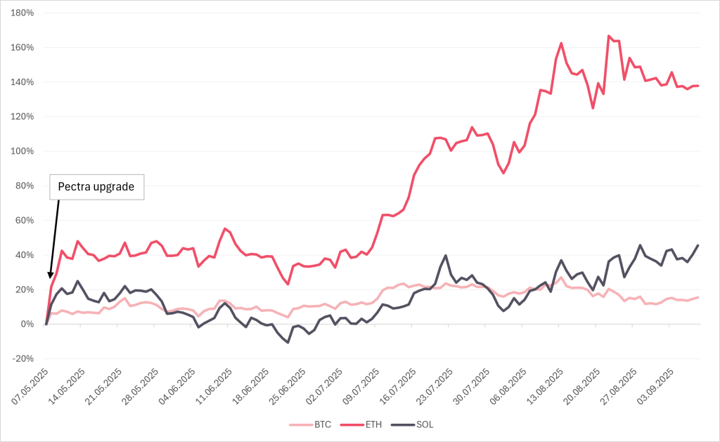 Динамика биткоина, Ethereum и Solana с момента обновления Pectra. Источник: Sygnum.