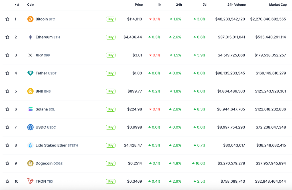 За последнюю неделю большинство монет из топ-10 по капитализации превзошли биткоин по доходности. Наибольший прирост показал мем-коин Dogecoin, цена которого за указанный период подскочила на 16,6%.