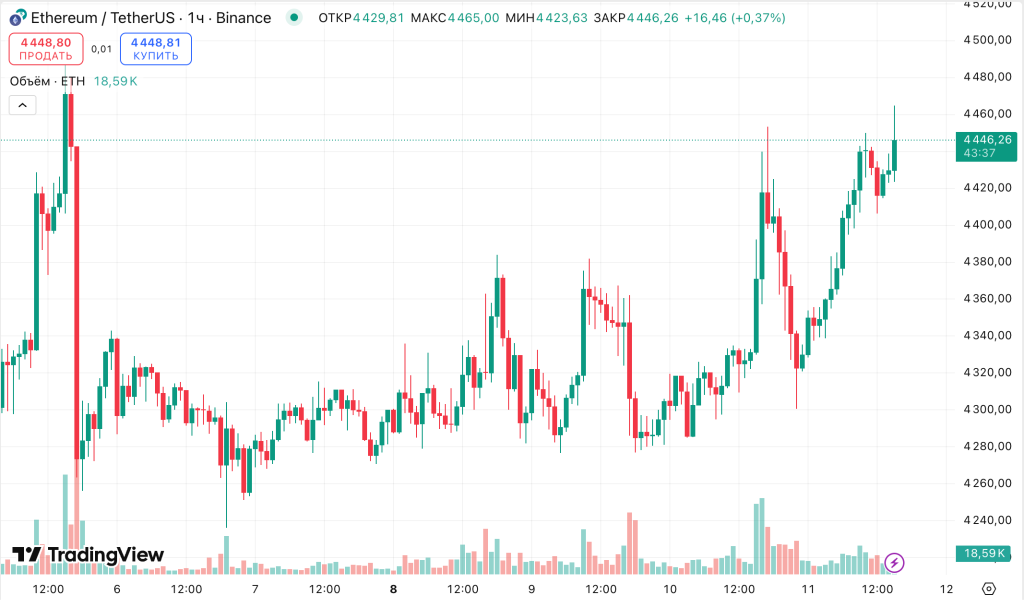 На момент написания вторая по капитализации криптовалюта торгуется около $4500. За последние сутки актив подорожал на 2,8%, чему поспособствовали позитивные данные по проминфляции в США.
