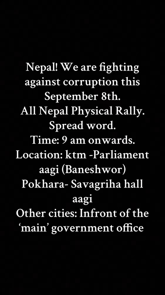 Призыв к протестам в сети. Источник: пост пользователя под ником Delulu_nana, r/Nepal, Reddit.