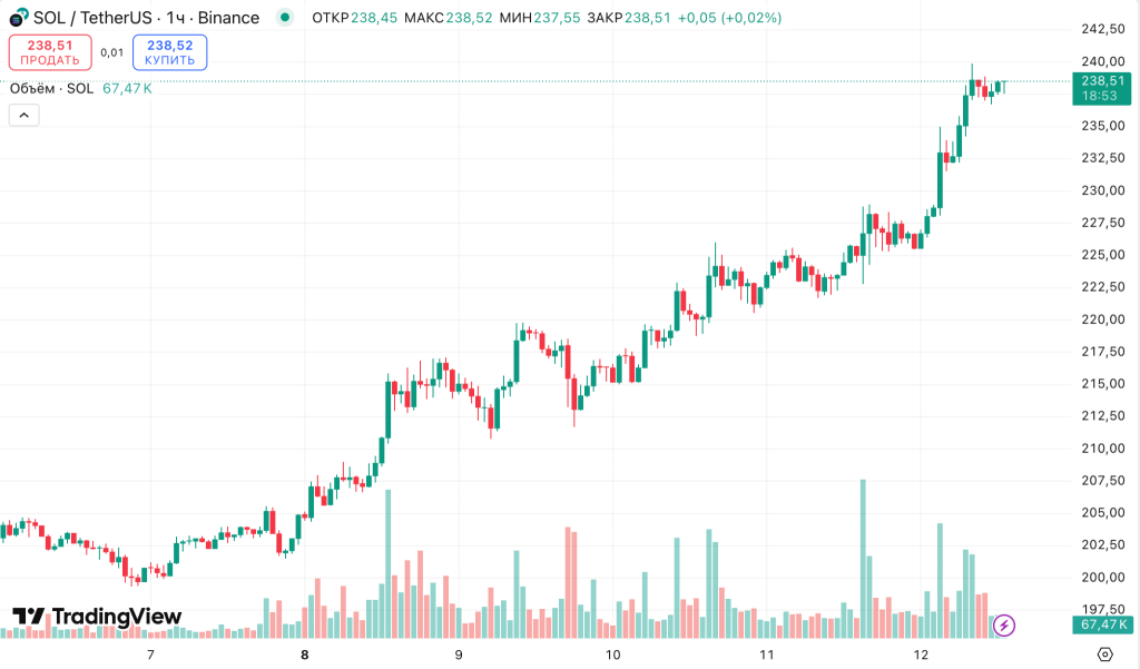 За последние сутки цена Solana выросла на 5,8%. На момент написания актив торгуется по $238.