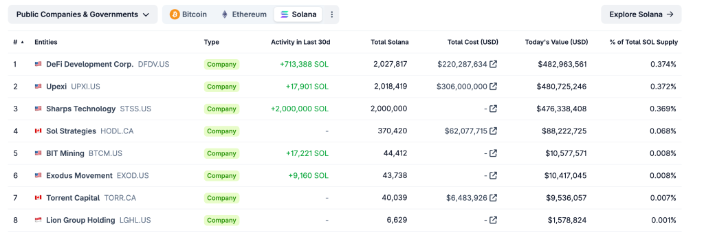 Компании с корпоративными резервами в Solana. Источник: CoinGecko.