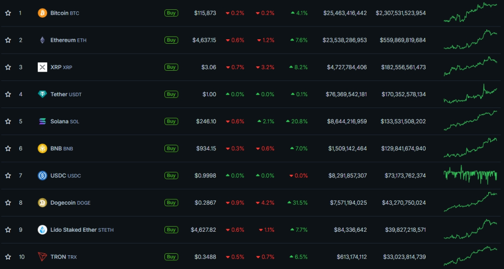Первая криптовалюта продолжила восходящий тренд. К концу рабочей недели котировки превысили $116 500. Цифровое золото не удержалось на достигнутых отметках и на выходных скорректировалось к ~$115 500.