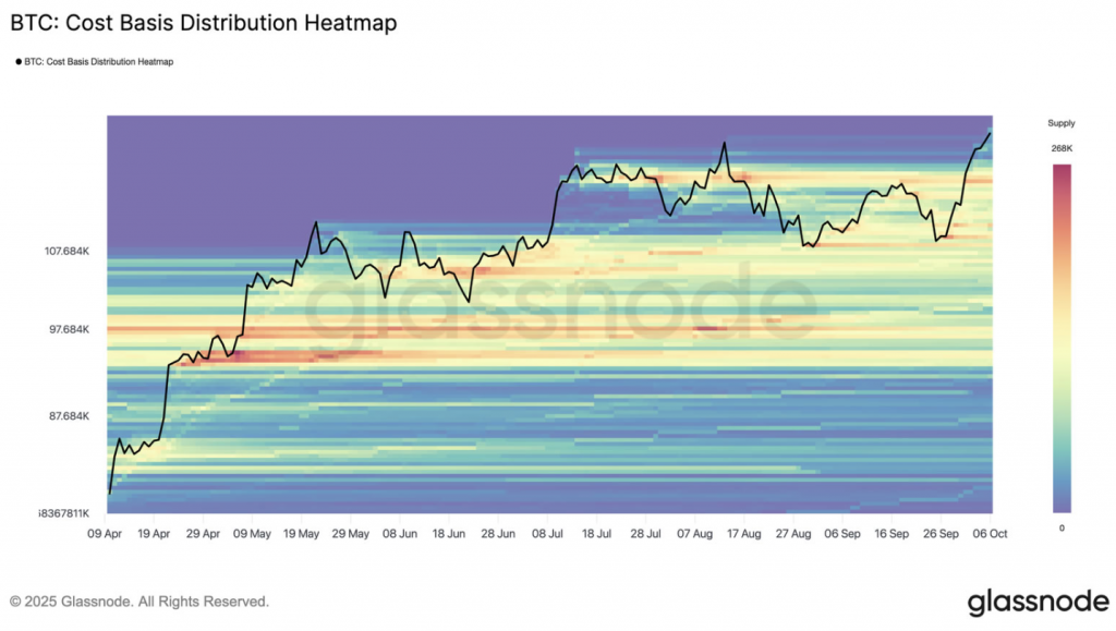 Тепловая карта распределения базисной стоимости от Glassnode показывает структурную поддержку. Базисная стоимость — это средняя цена, по которой монеты были приобретены. Между $121 000 и $120 000 поддержка ограничена, но становится более значительной около $117 000 — на этом уровне было приобретено примерно 190 000 BTC. «Хотя фазы поиска новой цены по своей природе несут риск истощения, потенциальный откат в этот регион может привлечь возобновленный спрос, поскольку недавние покупатели будут защищать прибыльные точки входа», — пишут аналитики. Зона $117 000 становится ключевой для стабилизации и восстановления импульса.