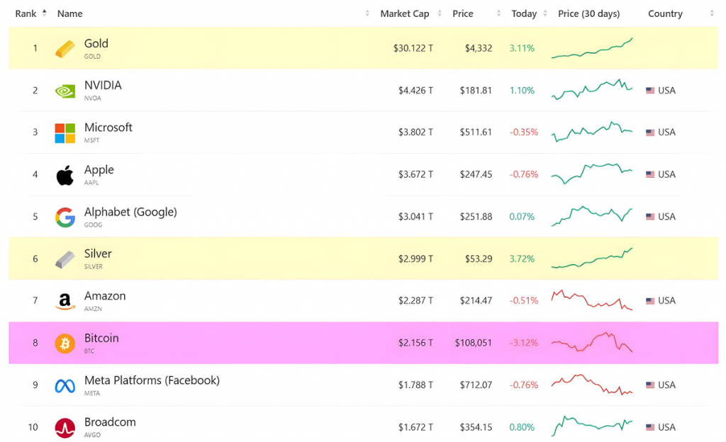 Капитализация золота преодолела отметку в $30 трлн, установив исторический рекорд после того, как драгоценный металл достиг почти $4 380 за унцию. Рыночная стоимость золота теперь в 14,5 раза превышает капитализацию биткоина ($2,1 трлн) и даже обогнала совокупную стоимость крупнейших технологических гигантов планеты — Apple, Microsoft, Nvidia, Amazon, Alphabet, Meta и Tesla, которая превышает $20 трлн. Что… Сообщение Золото достигло $30 трлн: это в 14,5 раза больше капитализации биткоина появились сначала на Hash Telegraph.