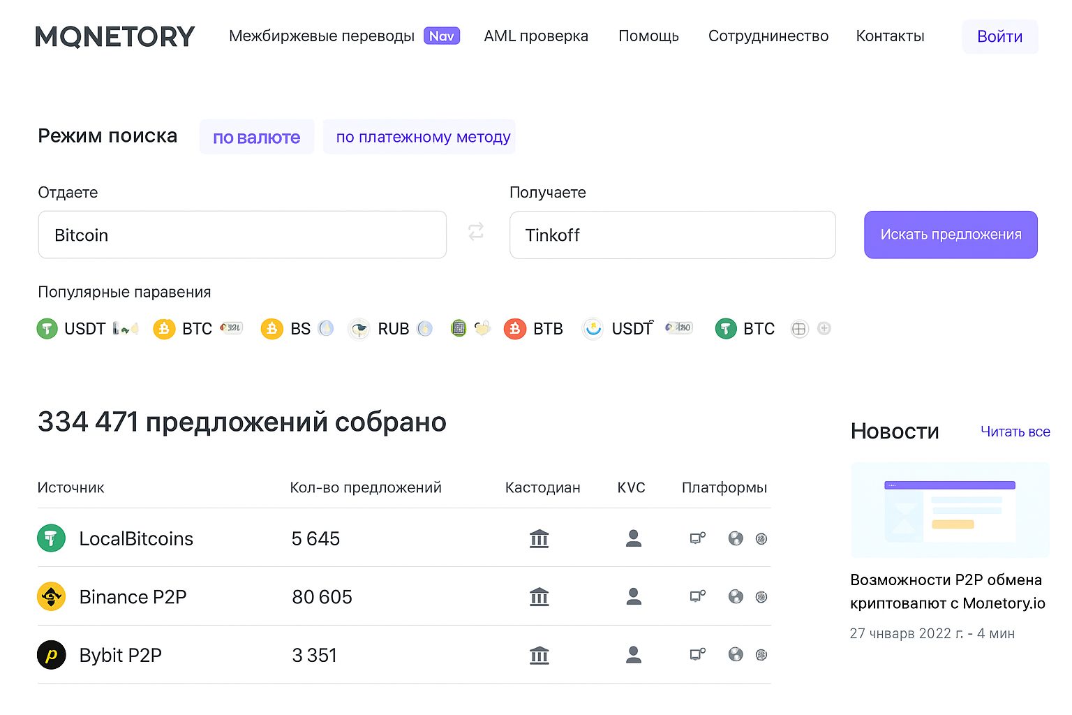 Это агрегатор предложений, а не полноценный «поисковик связок»: он показывает актуальные варианты обмена на p2p‑площадках в едином окне, что помогает быстро оценивать рынок и подбирать контрагентов.