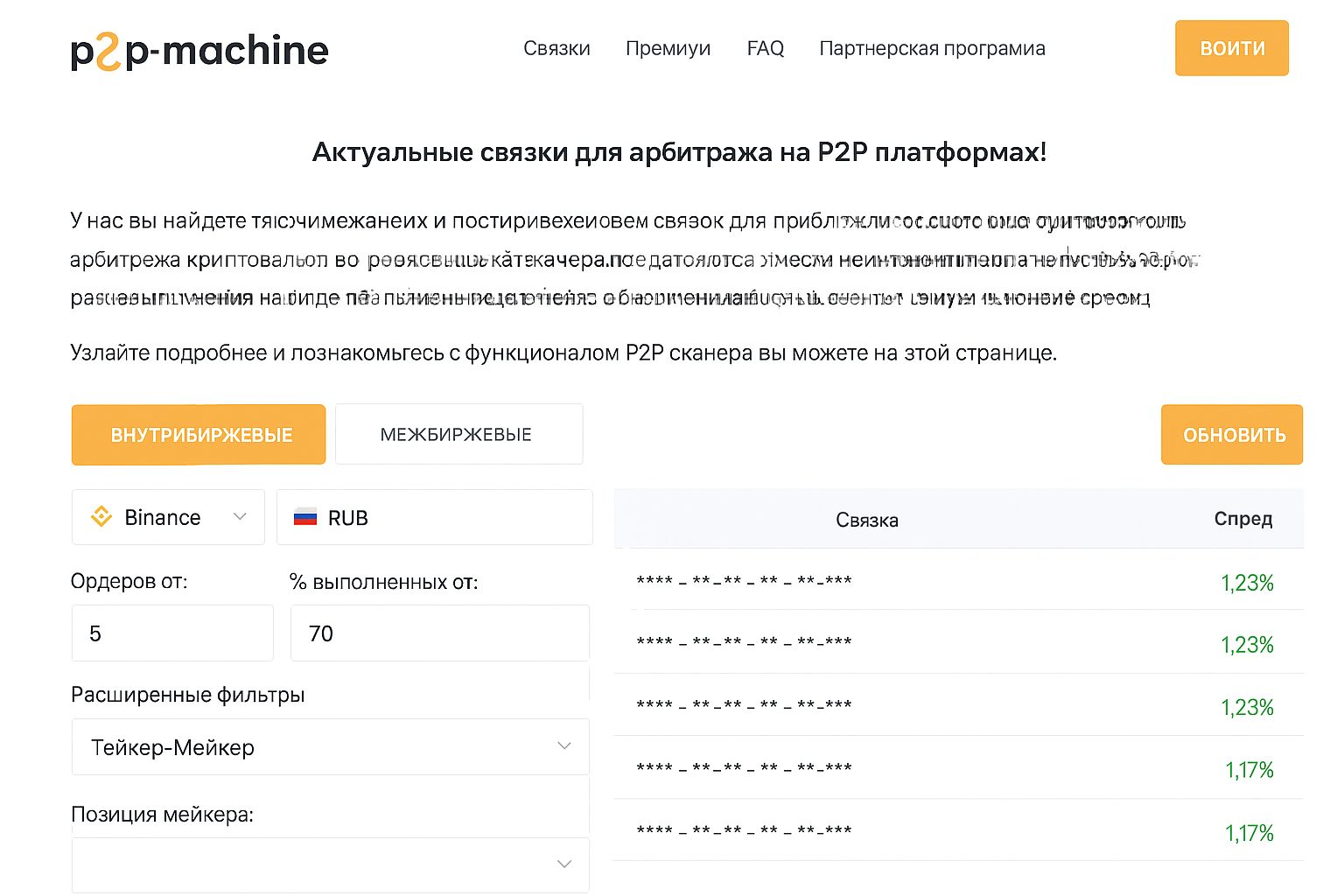 По подписке (88 USD в месяц либо 55 USD за две недели), по интеграциям (около 7 площадок) и по адресу ( ) инструмент полезен для комбинаций p2p+спот и поиска заданных процентов спреда.
