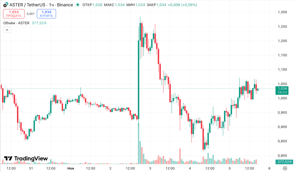 У Aster уже есть собственная одноименная монета. Ее рыночная стоимость составляет около $2 млрд, а цена — ~$1. Актив тоже вырос вопреки динамике всего сектора — +11% за сутки.