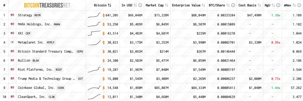 Топ-10 крупнейших держателей биткоина среди публичных компаний. Источник: BitcoinTreasuries.