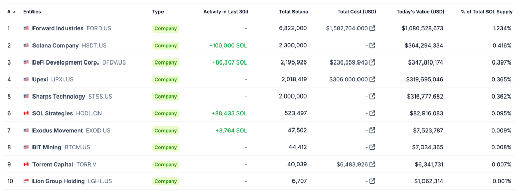 Топ-10 держателей Solana среди публичных компаний. Источник: CoinGecko.