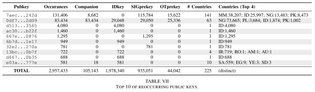 Некоторые криптографические ключи повторялись сотни раз, а у 20 американских номеров исследователи обнаружили шифр, полностью состоящий из нулей. Эксперты предположили, что причина — использование неофициальных или модифицированных клиентов WhatsApp, а не ошибка самого сервиса.
