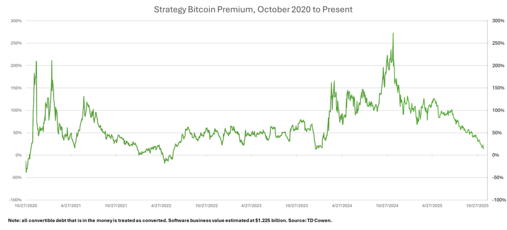 Премия акций Strategy к чистой прибыли от биткоина приблизилась к минимальным с 2021 года значениям, заявили аналитики TD Cowen в комментарии The Block. Эксперты поделились обновленными графиками: