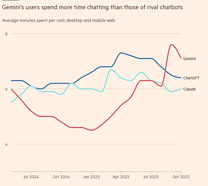 Пользователи проводят в чате с Gemini больше времени, чем в ChatGPT. Источник: FT.