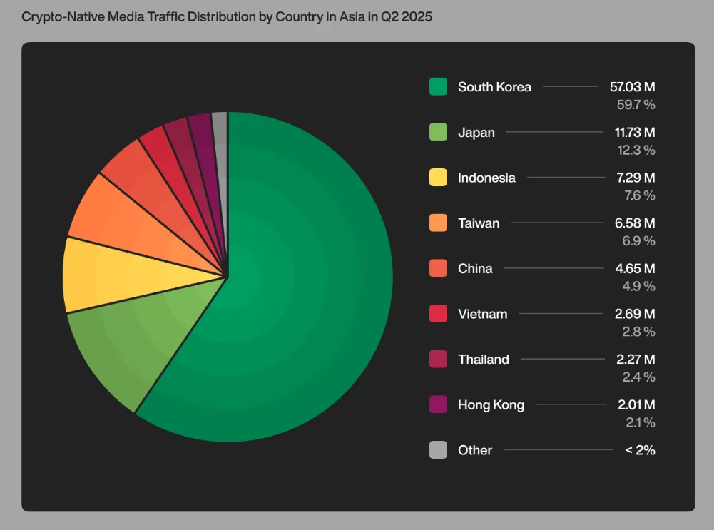 Географически основной трафик генерируют Южная Корея (57,03 млн визитов) и Япония (11,73 млн) — на них приходится 70,8% всех посещений криптоСМИ.