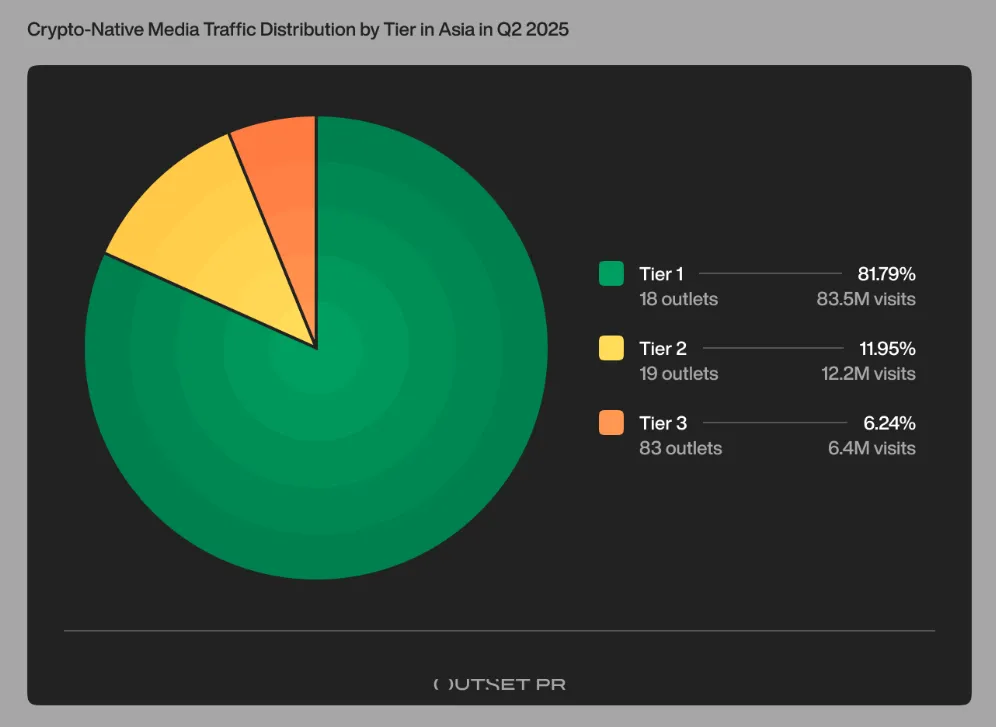 Рынок криптомедиа в Азии характеризуется высокой степенью централизации. Распределение трафика напоминает перевернутую пирамиду: