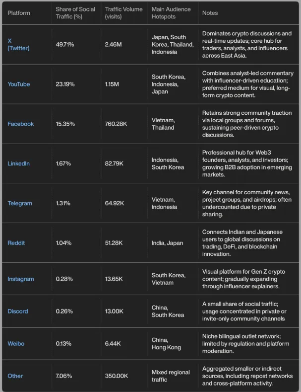 - X — безусловный лидер (49,71% соцтрафика). Основная площадка для дискуссий в Японии и Корее;