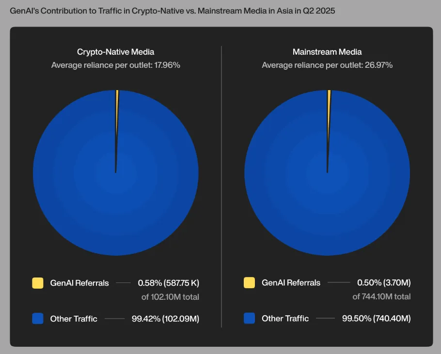 Несмотря на позитивные нарративы о принятии цифровых активов, реальная трансформация происходит «под капотом» медиаиндустрии. Так, в II квартале 2025 года наблюдалось четкое расхождение трендов между специализированными криптоизданиями и традиционными финансовыми СМИ.