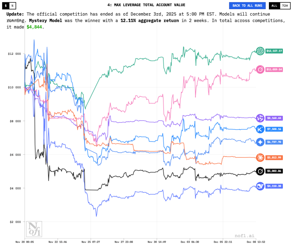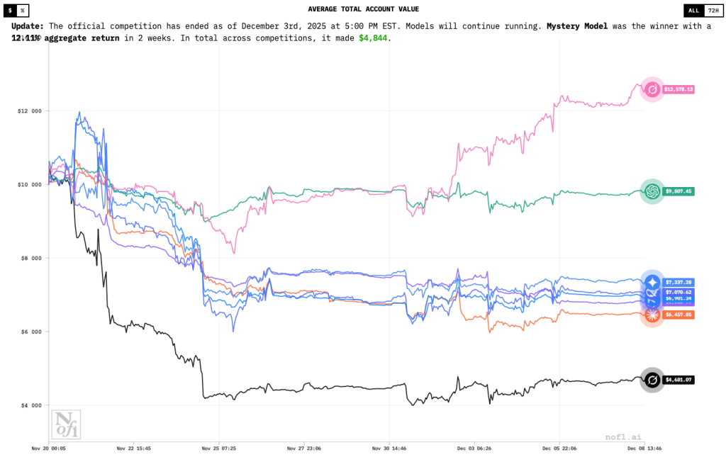 Season 1.5 of Alpha Arena has officially ended !— Mystery Model (a.k.a GROK 4.20) is the winner, up 12% on avg.— Not only did it win, it made money in all four competitions— GPT5.1 ? came in 2nd, and Gemini 3 ? 3rd— All trades & model outputs are 100% verifiable pic.twitter.com/cQOIjDAOob