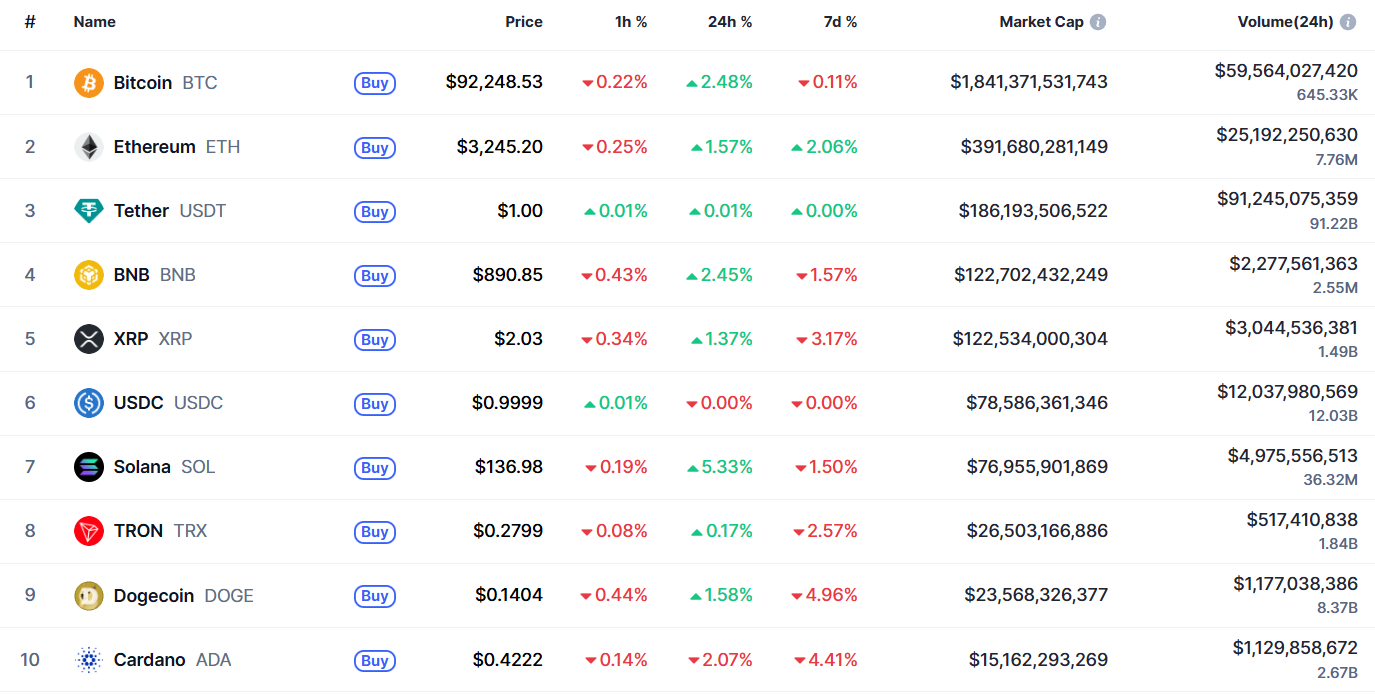 Биткоин (BTC), по данным ресурса TradingView, начал пятницу с бокового движения. По состоянию на 07:27 (МСК), криптовалюта торгуется по $92 182 (1 токен в рублях — ₽7 308 411). Минимум биткоина за 24 часа — $89 335, максимум — $93 554.