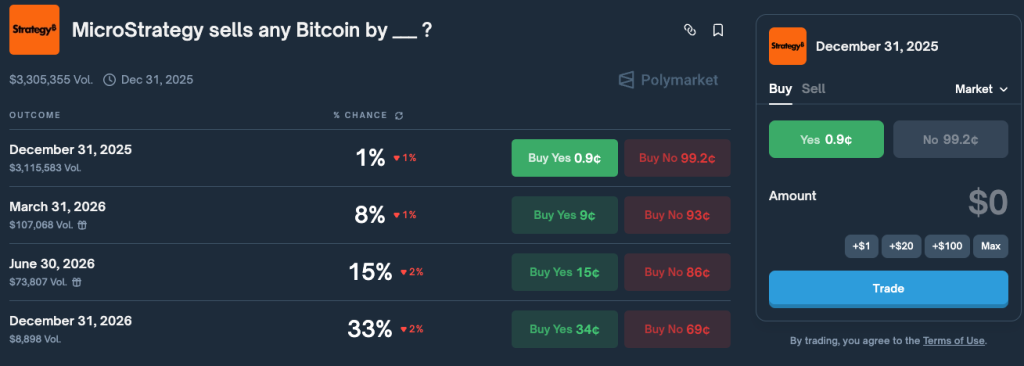 Данные Capriole Investments указывают на снижение активности «казначейских» компаний. Это может свидетельствовать об истощении институционального спроса.С другой стороны, пользователи Polymarket оценивают вероятность продажи биткоинов Strategy до конца года как крайне низкую — около 1%.