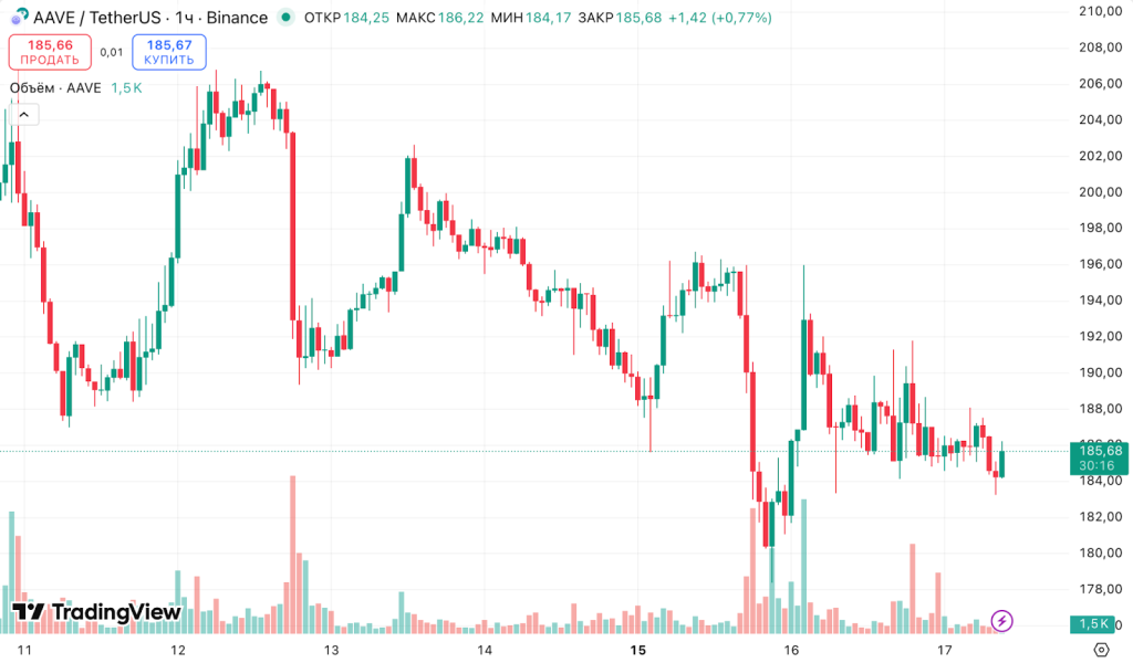 На фоне новости цена токена AAVE в моменте выросла на 3%, но затем скорректировалась на 1,1% — до $185.