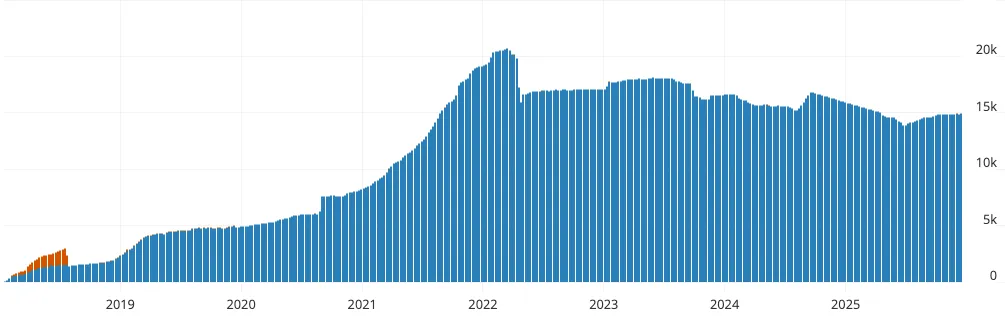 16 декабря аналитическая платформа Amboss зафиксировала пиковое значение на уровне 5637 BTC (около $490 млн). Согласно 1ML, текущий показатель составляет 5287 BTC (~$457,7 млн).