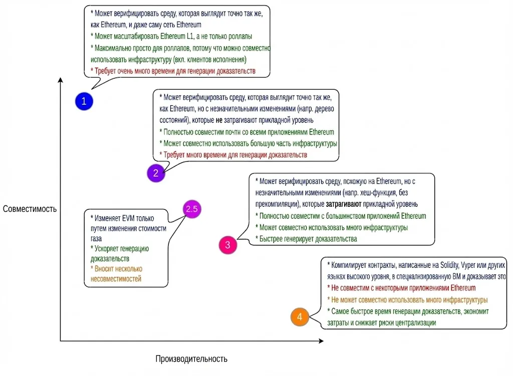 Виталик Бутерин предложил классификацию zkEVM, которая демонстрирует ключевой компромисс при разработке: выбор между совместимостью с Ethereum и скоростью генерации доказательств. Чем точнее система воспроизводит архитектуру основной сети, тем медленнее создаются ZK-пруфы.