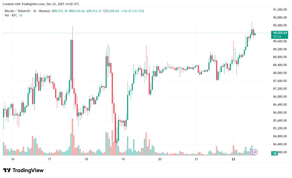 Котировки биткоина восстановились до отметки ~$90 000. На фоне роста участники рынка вновь заговорили о вероятности предновогоднего «ралли Санта-Клауса».