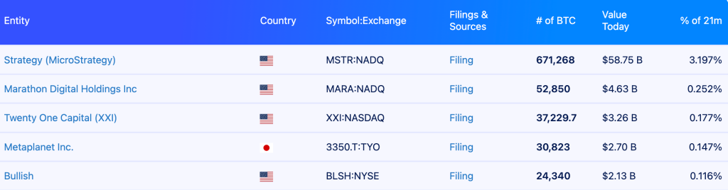 Strategy остается крупнейшим публичным держателем цифрового золота. Под ее управлением 671 268 BTC стоимостью $58,7 млрд.