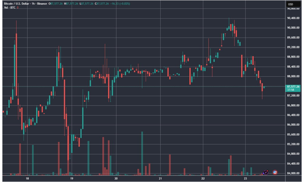 На момент написания биткоин торгуется на уровне ~$87 600, хотя накануне цена превысила отметку $90 000.