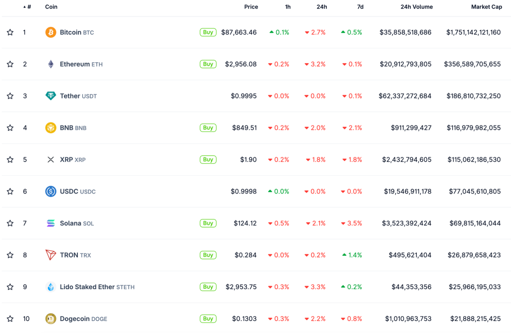 Курс Ethereum снова провалил психологически важный уровень в $3000. Все монеты из топ-10 по капитализации находятся в «красной зоне».